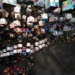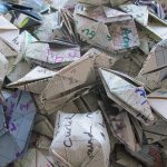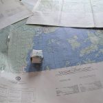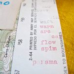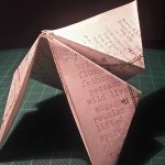 As a collaborator for Genesis Tree NY, visual artist Valerie Hird’s 10’x14’ tree assembled from 4,000 hand-folded paper forms from around the world, Jennifer contributed 100 original poem-origami cubes, made from 1950s surveillance maps of Panama, donated to her by the Smithsonian Tropical Research Institute in Panama. Conceived as missives from the Panamanian landscape, these poems spoke to Hird’s theme of the four elements which Jennifer built upon by adopting a Paul Celan reference to the poem as a “flaschenpost” or message in a bottle. Poems typed or written on cut map fragments were worked into origami cubeforms and sent back to New York to be carried within the body of the Genesis Tree. Recordings and photographs of the poems prior to embarkation document Jennifer’s process.